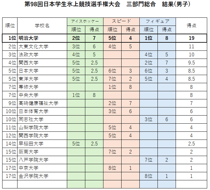 <男子> 第1位:明治大学 19点 第2位:大東文化大学 11点 第3位:法政大学 10点 第4位:関西大学 9.5点 第5位:日本大学 ・東洋大学 8.5点